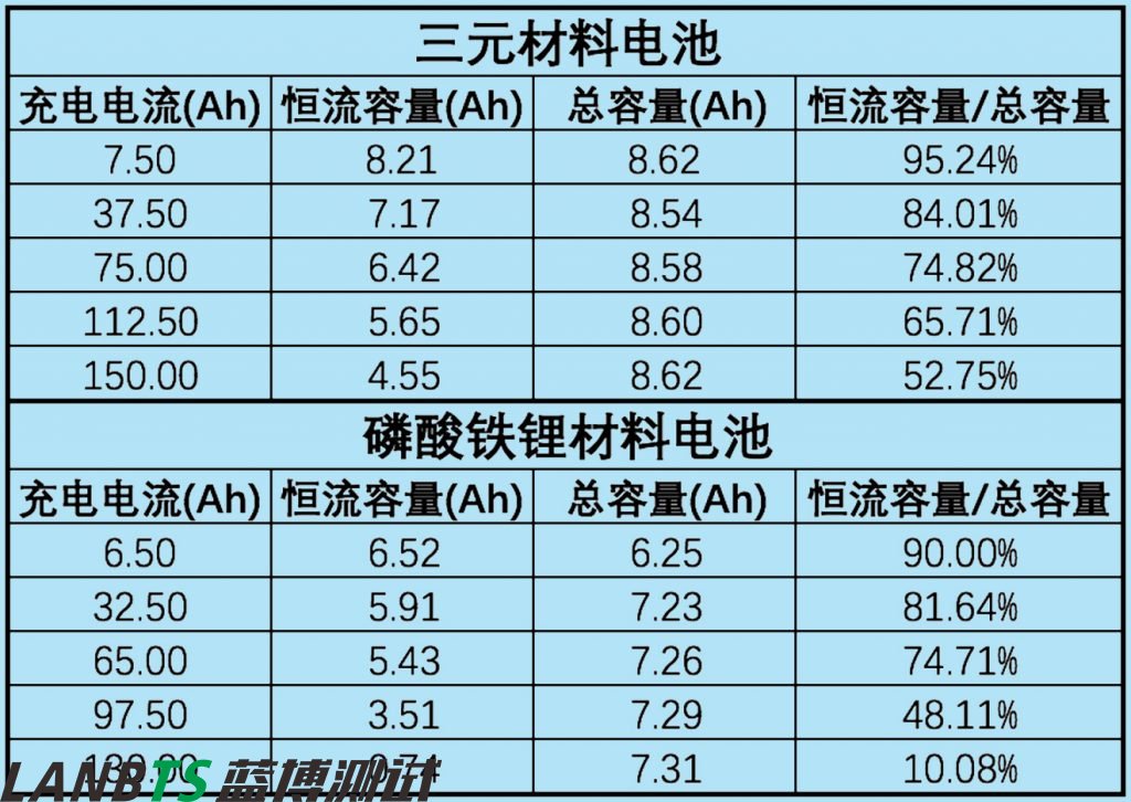 從表中可以看出,三元鋰電池與磷酸鐵鋰電池在10C以下充電時,恒流比無明顯差距,10C以上倍率充電時,磷酸鐵鋰電池恒流比例迅速降低,充電效率迅速降低。