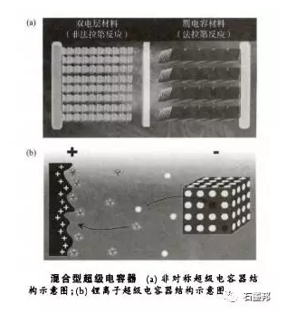混合型超級(jí)電容器一般是指由不同類型正負(fù)極電極材料組成的器件:一極是含贗電容電池材料,另一極是雙電層電容器材料。混合型臟電容器結(jié)合了雙電層材料的快速充放電和贗電容的高能m密度的特性,可同時(shí)具有高功率密度和高能量密度,彌補(bǔ)了在電池和超級(jí)電容器兩者不可兼得的空缺。